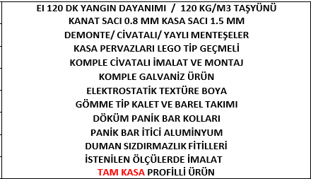 Renk: Yangın Kapılarının Dışa Bakan Tarafının RAL1013, içeri bakan tarafınınsa RAL9002 olması talep edilmektedir.