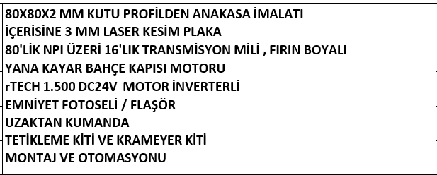 Aşağıda istenen nitelikler verilmiştir. Montaj yapılacak alanlar şu anda sahada mevcuttur. Kontrol edilebilir, ölçüm alınabilir.