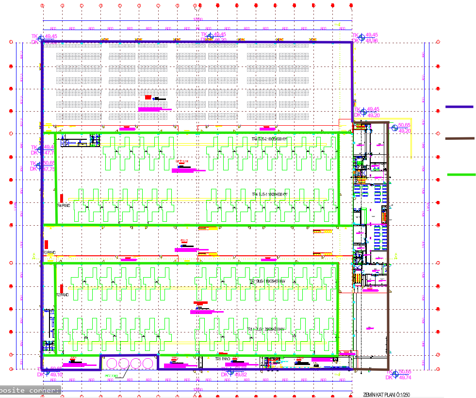 + Dış panel cepheyi (Kapsam A), iç ara cepheleri (Kapsam A) ve idari bina cam cepheyi (Kapsam G) FİRMA proje dosyalarından görebilir ancak taslak niteliğinde bir çizim yine aşağıda paylaşılmıştır (Resim-1). Esas olan ve tüm detayları içeren proje çizimleridir ve esastır. Taslak yalnızca destek niteliğindedir. Çakışma durumunda projeler yine esastır. Taslakta mavi çizgi dış cephe panelini, yeşil çizgi ara panelleri, kahve rengi çizgi ise cam dış cepheyi göstermektedir.