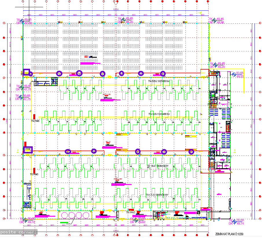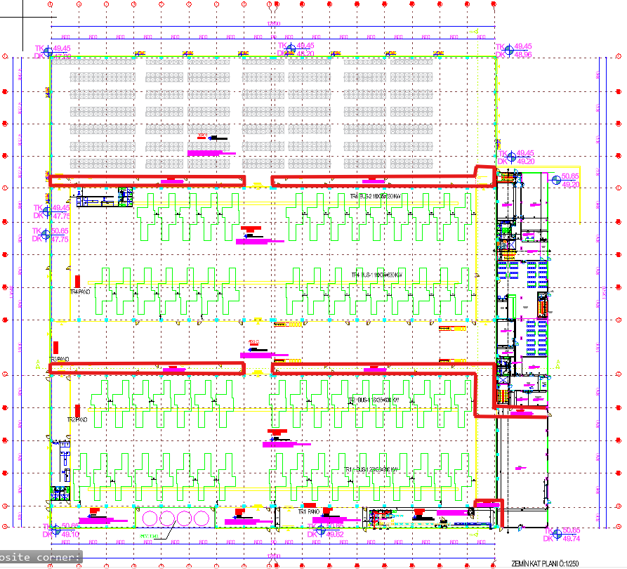 Bina yangın sistemi sprinkler sistem olarak revize edildiğinden kaçış koridorları iptal edilmiştir. Projelerdeki tüm yangın kapıları, endüstriyel kapılar ve yükleme rampaları kapsama dahildir. Kaçış koridorlarındaki bu iptal durumu nedeyiyle, 12 adet yangın kapısı, 2 adet sarmal kapı kapsamdan çıkarılmıştır. Bu kapılar Resim-2'deki çizimde mor ile işaretlenmiştir. İptal edilen yangın kapıları mor daire içine, iptal edilen sarmal kapılar mor kare içine alınmıştır. Diğer tüm kapılar kapsam dahilinde talep edilmektedir.