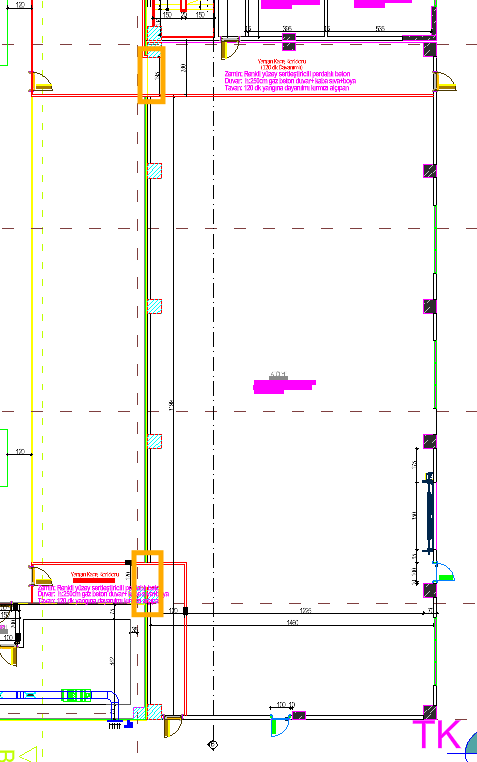 Yangın projeleri sprinkler sistem olarak revize edileceğinden Resim-4'te kırmızı ile işaretlenmiş kaçış koridorları iptal edilmiştir. Sonradan yapılması istenirse, sonraki ihalelerde değerlendirilecektir. Ancak bu aşamada kapsam dışında bırakılmıştır. Bu nedenle bu koridorların inşa edilmemesi talep edilmektedir. Yine işaretli kaçış koridorları iptal edildiğinden Resim-3'de turuncu kutu içerisine alınan alanların, duvar örülmesi talep edilmektedir. Ancak E kapsamı çerçevesinde bu iki alana birer adet (toplam 2 adet) yangın kapısı ilave edileceği hatırlatılır.